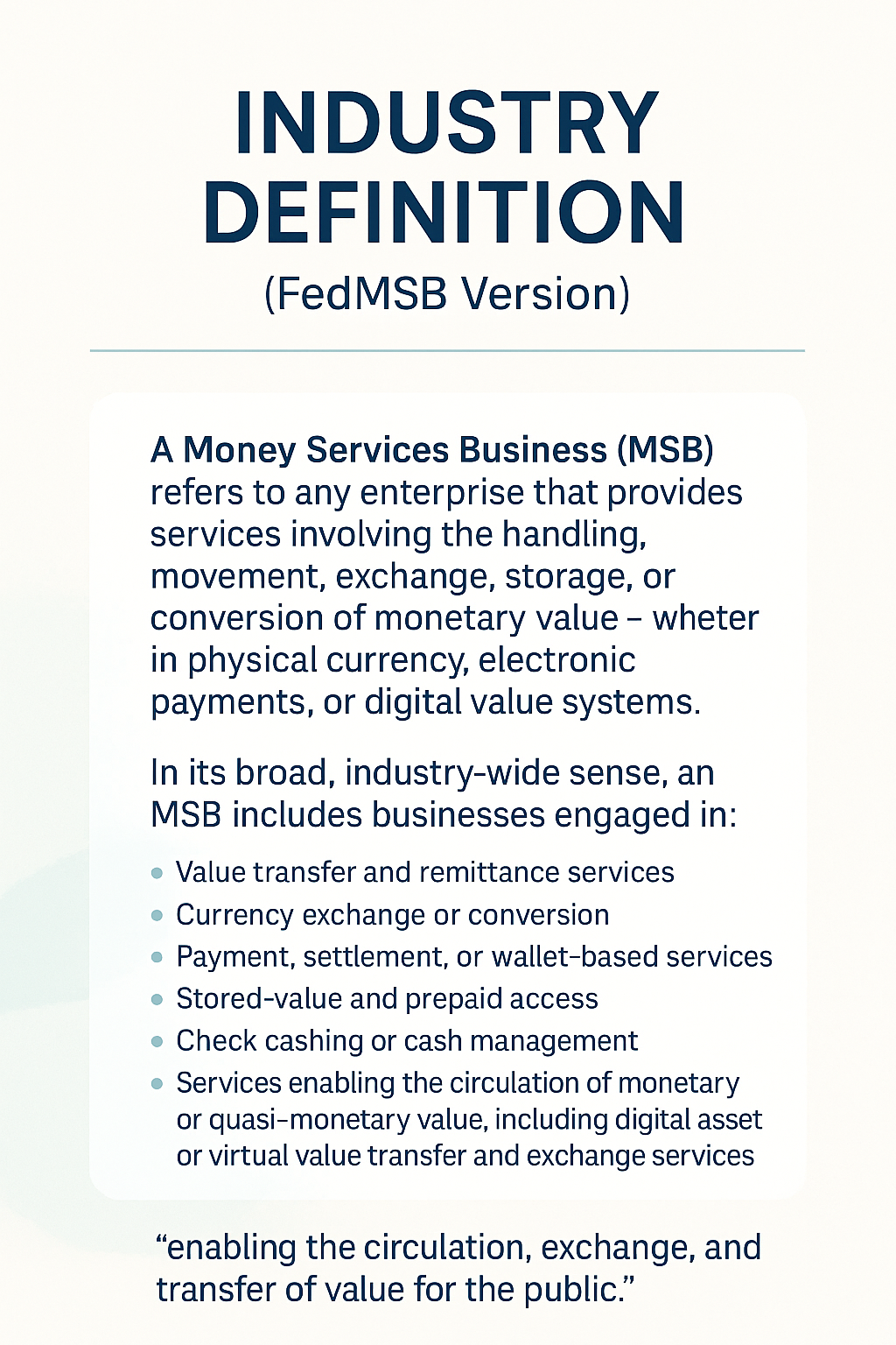 Under FedMSB’s framework, a Money Services Business (MSB) is defined as any enterprise that provides services involving the handling, movement, exchange, storage, or conversion of monetary value, whether in physical currency, electronic payments, or digital value systems.